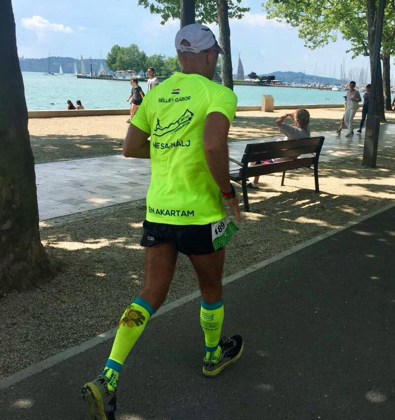 Viszont itt már elfogytam. Minimális futás, sok séta. Végem volt. Kezdtem fejben is elfáradni. Nagyon lassan haladtunk…..és jött a meleg. Póló le, de a hosszúnadrágot nem volt erőm átvenni (hiba volt), mindegy miben sétálok gondoltam. Soha nem lesz vége. De Káldi Peti azt mondta egyszer, ilyenkor arra kell gondolni, hogy egyszer mindennek vége lesz. De ennek nem. Nincs még egy olyan hosszú, nyílt, napos egyenes a Földön, mint Siófokon. Soha nem lesz vége….A sétától bekötöttek az izmaim közben, féltem, hogy egy rossz mozdulatnál szakadok, így még óvatosabb lettem. Nem mintha tudtam volna gyorsan sétálni. Aztán jött az, hogy már annak is örültem, hogy egyáltalán tudok sétálni. Nem gondoltam volna, hogy lesz ilyen. Magamban úgy kalkuláltam, hogy 5 km-t óránként a legrosszabb esetben is tudok haladni. Hát most ezért küzdeni kellett rendesen. Reggel 8-tól ott volt már velem Balázs és Tomi is, így már 3 biciklis tolta mellettem a biciklit….Mindenki leelőzött, úgy éreztem. De ekkor ez már nem érdekelt. Túl kellett élnem, be kellett érnem valahogy, főleg, hogy már a fiam is mellettem volt.